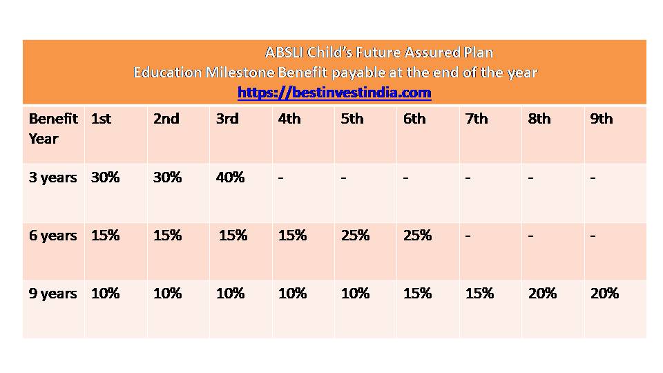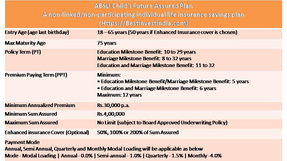 Aditya Birla Sun Life Insurance has brought a new plan Aditya Birla Sun Life child future assured plan ( ABSLI child Assure Plan) offering life cover to the parent, payout for important milestone of child, and of course tax benefit for you.