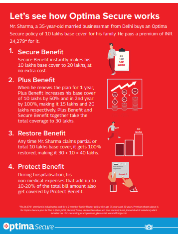 HDFC Ergo health insurance company had recently launched HDFC Ergo Optima secure policy. Optima Secure provides multiple benefits like 2X cover from day 1 and 50% increase in sum insured from 2nd year and again 50% increase in 3rd year too. Optima Secure also provide restore benefit on partial or complete use of sum assured from second claim onwards.