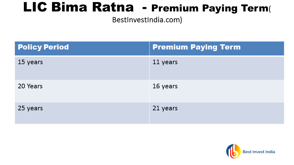 LIC Bima Ratna policy is available for all age group from 90 days to 65 years. But one can avail the 864 LIC Plan for different premium paying terms ( 11/16/21 years) as mentioned in the table.