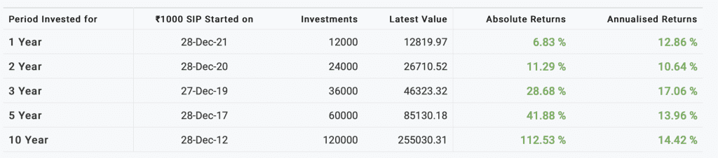 SIP returns of an Equity Flexi cap Fund ( 29 DEC 2022)