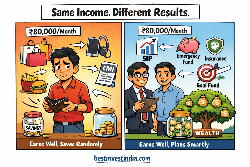 Without proper planning, income gets spent on daily expenses, EMIs, lifestyle upgrades, and impulsive purchases. At the end of the month, very little remains for meaningful savings or investments.